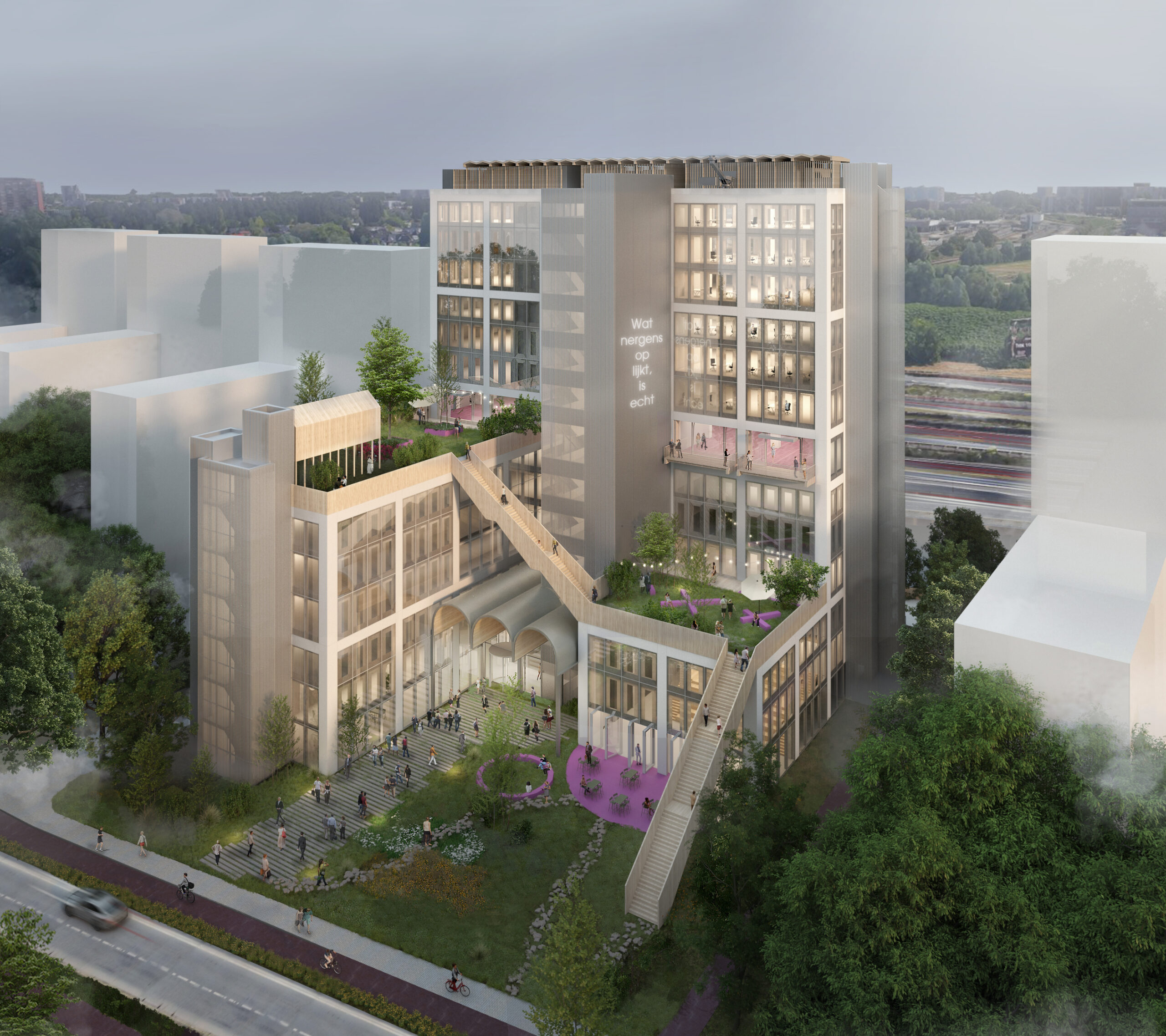 Er komt een flexibel gebouw van ongeveer 17.000 m² dat gebruikt kan worden voor werken, slapen en wonen. Dit bijzondere gebouw in Rotterdam heeft een speciale status dankzij extra aandacht voor duurzaamheid en een gezonde leefomgeving, door het BREEAM Excellent certificaat en de Well certificering. Dit houdt in dat het gebouw excellent scoort op het punt van duurzaamheid. Dit zit niet alleen in de groene daken maar ook in een bijzondere gevel met zonnecellen die bijdragen aan het opwekken van energie voor het gebouw zelf. Het gebouw is geschikt voor verschillende soorten gebruik, door verplaatsbare tussenvloeren en techniek die flexibel kan worden uitgebreid. Het gebouw heeft twee gevels die zich aanpassen aan de omgeving. Aan de kant van de A16 is het gebouw gesloten, om zo de drukte van de weg tegen te houden. De zesde verdieping heeft een bijzondere vorm en uitzicht. Hier kunnen allerlei soorten bijeenkomsten worden gehouden. De parkzijde van het gebouw is heel herkenbaar en toegankelijk. Hier wordt het groen uit de omgeving bijna het gebouw ingetrokken door de dakterrassen op de derde en zesde verdieping.